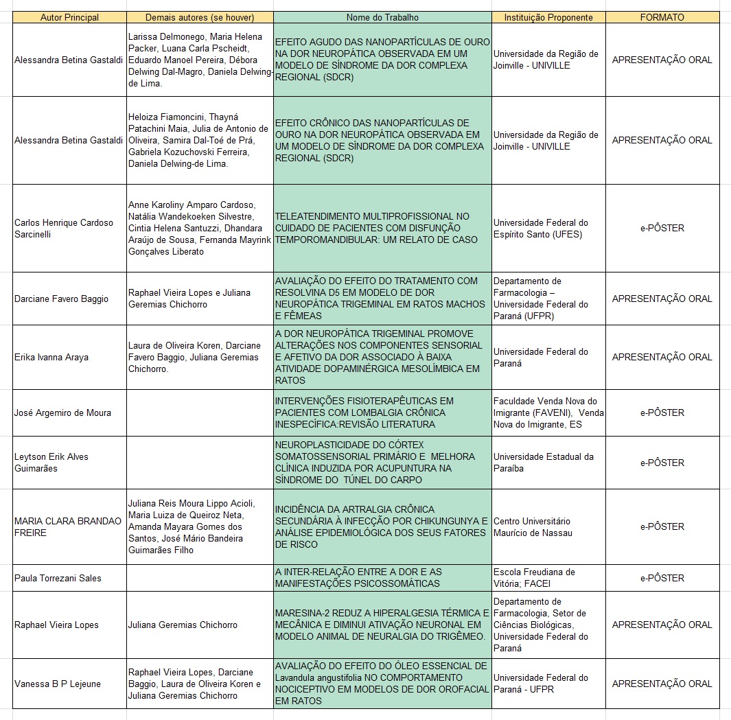 Relação de trabalhos aprovados no IV Simpósio de Fisiopatologia da Dor e I Congresso INC Interdisciplinar da Dor (ordem alfabética por autor principal)